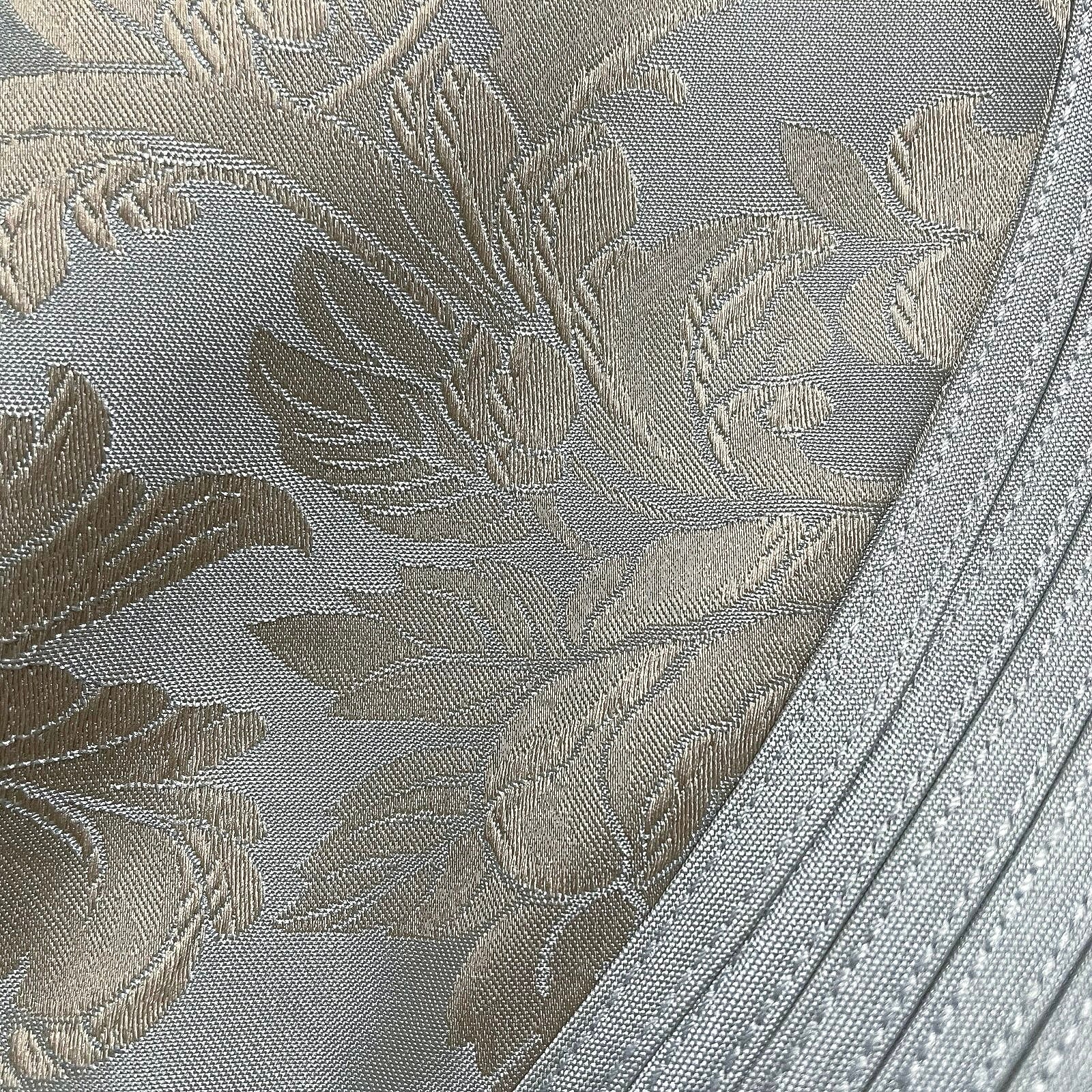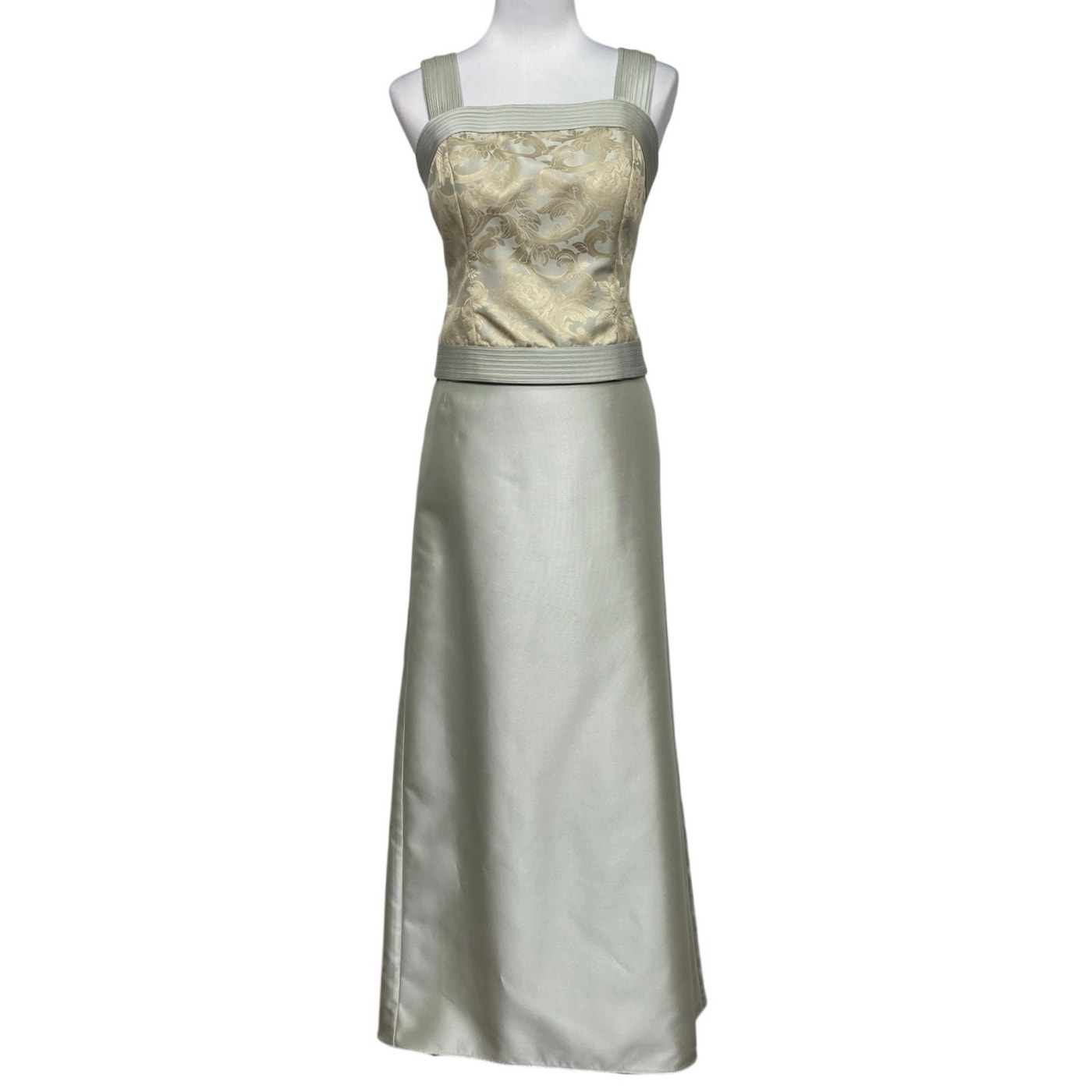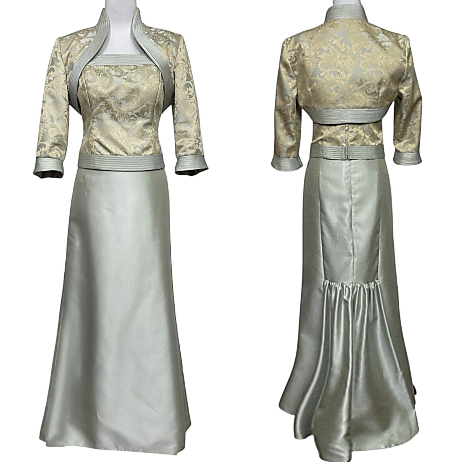 Vintage silvery‑blue brocade formal evening gown. This three‑piece ensemble has a tailored back zip tank top, a coordinating bolero jacket, and a sweeping satin skirt that embodies the refined glamour of late‑90s eveningwear. The brocade top and jacket feature intricate metallic patterning that feels both regal and timeless, while the jacket’s three‑quarter sleeves and open-front silhouette add a polished, graceful finish. The floor-length satin skirt with back zip glides beautifully, with gentle back pleating that creates subtle volume and a statuesque drape. Fully lined.